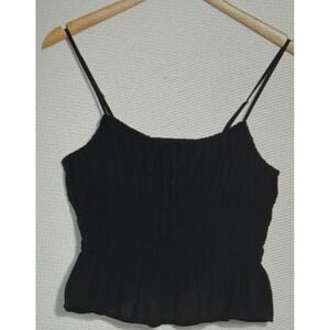 Black smocked peplum camisole top. This sleeveless top features adjustable spaghetti straps and a flattering smocked bodice that transitions into a peplum hem.