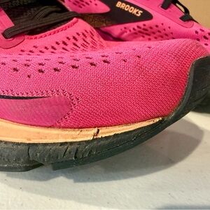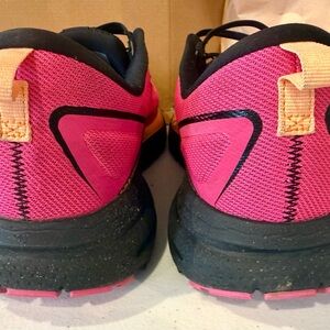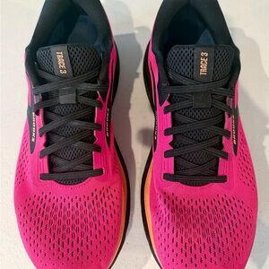 Size 11 Women’s Brooks Trace 3 Running Shoes. Bright pink, black and pale orange, elastic non-tie laces (black set of standard laces included with shipment). The shoes are cushioned, lightweight, and breathable with a mesh upper material, providing comfort and performance for running or everyday wear. Gently worn, only signs of wear on uppers is outer front on both as pictured. Insoles from Fleet Feet. Minimal wear on soles.