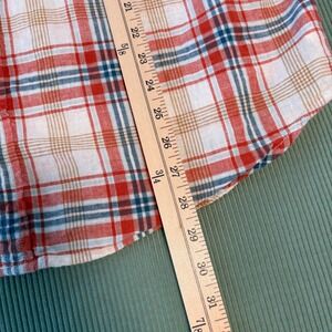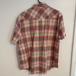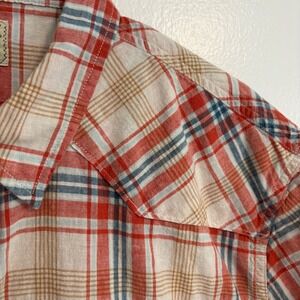 Lucky Brand short sleeve western shirt in a classic plaid pattern. This comfortable shirt features pearl snap buttons and two chest pockets with snap closures. The breathable cotton and linen blend makes it perfect for warm weather. Ideal for casual outings, weekend wear, or a laid-back concert.