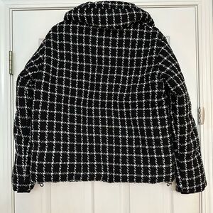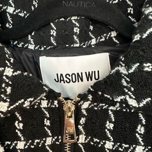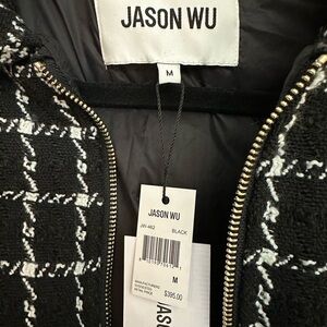 Pit to pit 22”. Length 24” Discover this chic Jason Wu Reversible Tweed Puffer Jacket with Hood in a classic black and white houndstooth pattern. This stylish puffer offers versatility with its design, allowing for polished looks. Featuring a front zip closure, and side pockets, it's perfect for adding a touch of elegance to your cold-weather wardrobe. The inner side is a sleek solid black, offering a simpler aesthetic. This jacket is new with tags. A timeless piece that sold out online. Retail $395