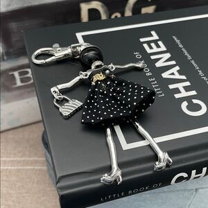 Chic bag charm - key holder with a black polka dot dress design. Features silver accents for a stylish touch.