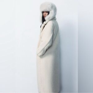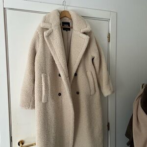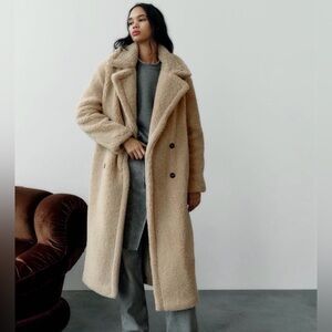 Long fleece coat with lapel colour and long sleeves. Front wealth pockets. Total lined interior. Front double breasted button closure.