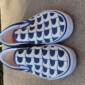 Fun and easy slip-on Vans. Blue and white wave pattern and orange accent tag adds style. Perfect for play and casual outings.