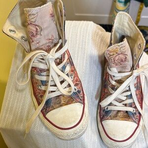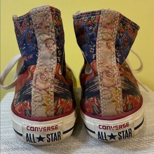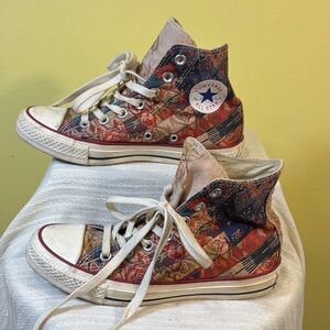 Unique patchwork design with vibrant colors. Classic high-top style. Perfect for a bold look. Size US 6