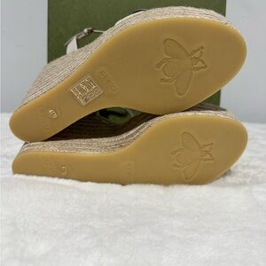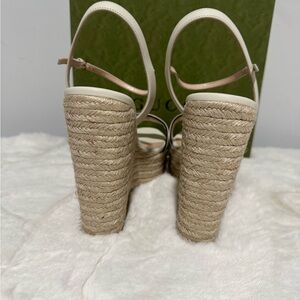 Stylish Gucci wedges with a white strap and gold accent. Perfect for adding height and elegance.