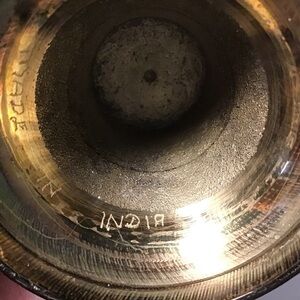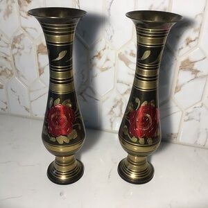 Add unique global flair to your home with this vintage brass‑look combination vase that also works as a reversible candlestick. Featuring a hand‑engraved “Made in India” marking on the bottom and decorated with a gold, black, and red floral motif, this piece brings rich color and texture to your décor. Use it as a decorative vase or flip it into a sculptural candle holder — versatile vintage charm for shelf, mantle, or tabletop.