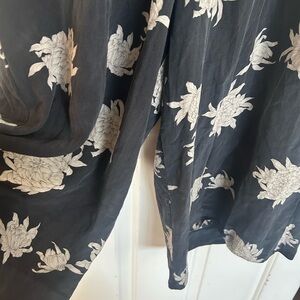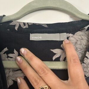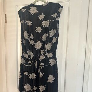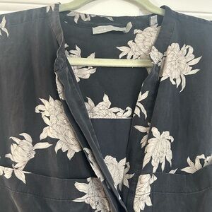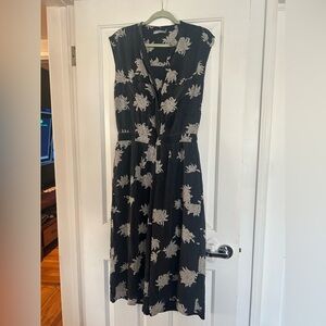 Vince midi jumpsuit in navy with white florals. Deep pockets at the hip and front pockets as well. Elastic waist and wide leg pants for a loose fit. Flattering neckline.