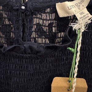 Brand is Umgee Plus. Women’s size XL. Navy blue chiffon blouse with raised floral texture, long sheer sleeves, elastic smocked bodice, and elastic cuffs for a flexible, flattering fit. Lightweight with an opaque lining through the body and flowy drape throughout. Excellent condition with no stains, holes, or fabric wear noted. Original tags are still attached.