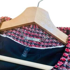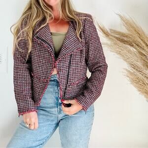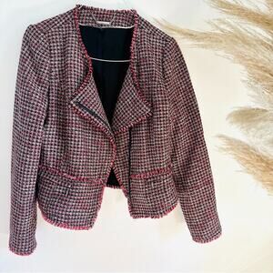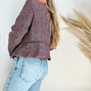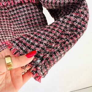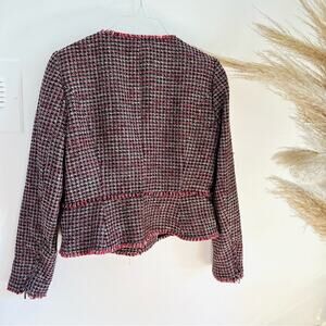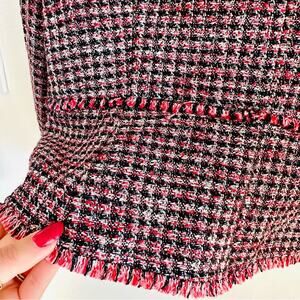 WHBM Pink Black Red Tweed Woven Peplum Ruffle Fringe Moto Zip Blazer Jacket 4