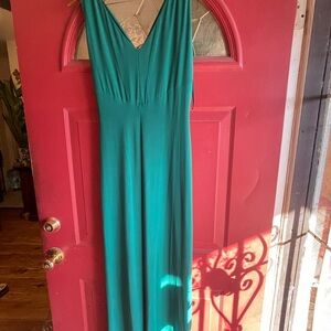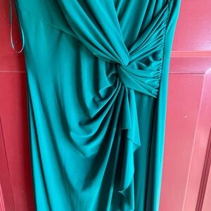 Chic teal maxi dress with a draped front. Ideal for elegant occasions.