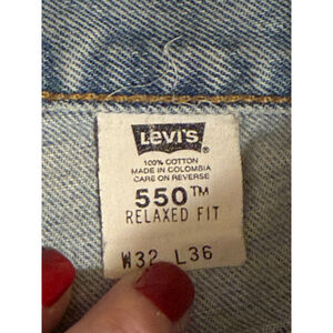 These are a pair of pre-owned women's Levi's 550 Relaxed Fit straight leg jeans in a light blue wash. The jeans feature a classic five-pocket design and a button and zipper closure. Visible imperfections include a small yellowish stain on the left thigh and fraying at the bottom hems. The waist measures approximately 14 inches across, the rise is about 10 inches, and the inseam is approximately 33 inches. The care tag indicates 100% cotton, made in Colombia, and the size tags show W32 L36.