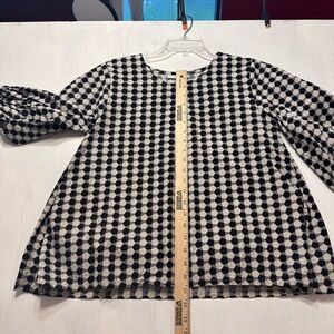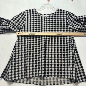 Elevate your wardrobe with this stylish Bryn Walker blouse in a bold black and white geometric print. Made in the USA from 100% organic cotton, this top features a lightweight, breathable feel—perfect for all seasons. The relaxed fit, pleated neckline, and 3/4 balloon sleeves add a modern yet effortless flair.