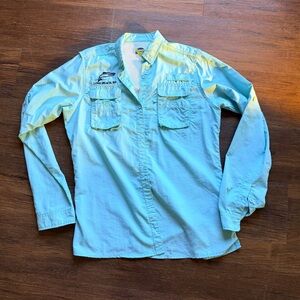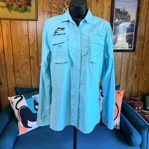 Amazing Women’s Sport Fishing Button Down Shirt! Pockets and handy features for your fishing miscellany. Aqua blue marine color; vented mesh breathable fabric in back. Logo says Long Beach, WA with a fish design. In excellent condition - there is a small spot on the arm area that is not noticeable when wearing - see pics. Otherwise pristine and so cool!