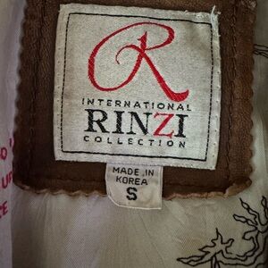 Stylish brown leather bomber jacket with embroidered details. Perfect for a casual look.