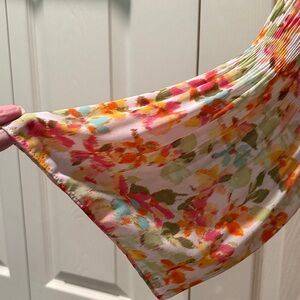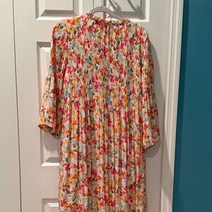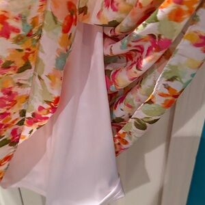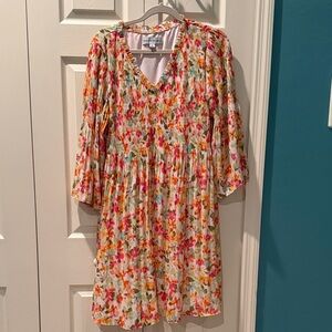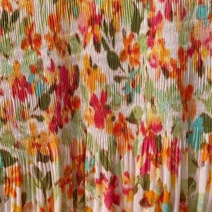Vibrant floral design with a playful mix of colors. Ideal for Easter or any Spring outings. Comfortable and stylish with ruching all through the bodice down to the waist.