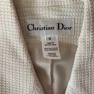 Sophisticated Dior blazer dress. Cream color with textured design. Perfect for elegant occasions.