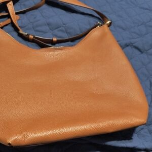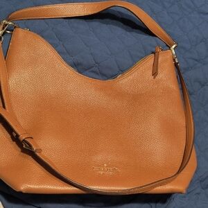 Chic Kate Spade hobo bag in rich caramel. Sleek design with short and long straps. Ideal for daily use. Measurements 13 in H, 16 in L, 5.5 in W.