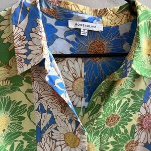 Fresh, colorful, and easy to wear, this Rose & Olive dress features a bold multicolor floral print with a relaxed, flattering silhouette. Designed with a classic collar, button-front style, and three-quarter length sleeves, it can be worn as a dress or styled as a long tunic over leggings or jeans. Lightweight and breezy, it’s perfect for spring and summer days.