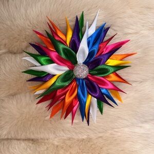 Vibrant satin ribbon flower brooch with a sparkling center. Features a mix of colors including red, pink, orange, yellow, green, blue, purple, and white.