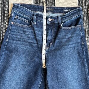 Stylish straight leg jeans. Classic dark blue wash. Frayed hem detail. Perfect for casual wear.