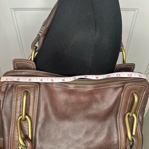Amazing brown leather shoulder bag. Features gold over sized hardware. 14 inches long by 8 inches tall.