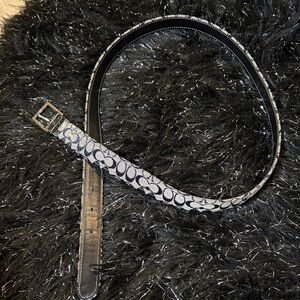 Elegant Coach belt with signature pattern. Features a sleek silver buckle.