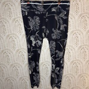 Beautiful Athleta sonic capri performance leggings in a navy blue base with an elegant white and gray floral print. High-rise waistband with interior pocket and side pockets. Four-way stretch, squat-proof, moisture-wicking fabric—perfect for yoga, running, gym, or athleisure wear.