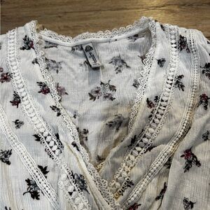 Measurements shown, white pink maroon, V neck wrap, elastic cuffs, beautiful lace detailing around neckline, wrinkly fabric, sundress summer spring vacation garden party event flowers feminine frilly.