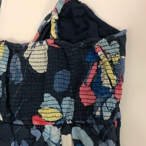 Abercrombie & Fitch in size Large Dress in Blue White Pink and Yellow in Floral Abstract Print Straps sleeveless with smocking in back for stretchy comfortable with ruffle front flap and lining in 100% Cotton in Excellent Condition
