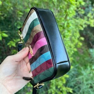 Keywords: Coach, wristlet, signature canvas, multicolor, mini, zip-top, detachable strap, card slots, gold hardware, pre-owned.