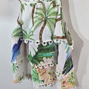 Features a bold palm tree and floral print, layered design, and a beautiful scalloped lace trim for a fun, resort-ready