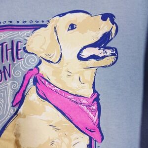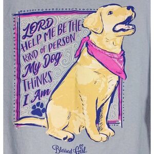 The product is a "Blessed Girl" t-shirt in light blue, featuring a solid pattern with a crew neckline and short sleeves. It is made from 100% cotton, making it comfortable for casual wear. The t-shirt is in size S, perfect for a regular fit for women. With a pullover closure and basic style, this t-shirt is ideal for travel and everyday casual occasions, showcasing a classic dog theme.
