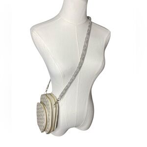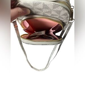 Elevate your style with this elegant crossbody bag featuring a chic geometric design. Ideal for any occasion. Heart zipper pulls 3 compartments very roomy has one minor call out inside one compartment shown in photo. Comes with extra shorter strap