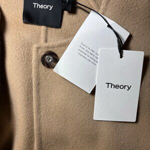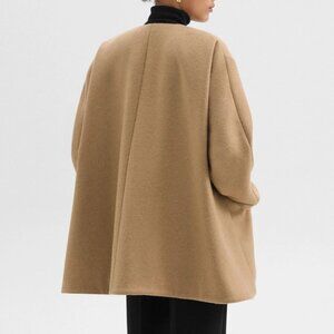 New with tags Theory “Crew Cape DF” coat in camel. Chic minimalist silhouette with a clean crew neckline and cape-style, relaxed drape easy to layer over knits and blazers. Button front with slip pockets and an effortless, modern fit that works dressed up or casual.