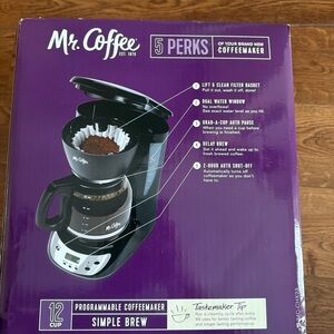 Enjoy a perfect brew every time with the Mr. Coffee Black Programmable Coffeemaker. Featuring a sleek black design, this coffeemaker is perfect for any kitchen. Easy to use with programmable settings for your convenience.