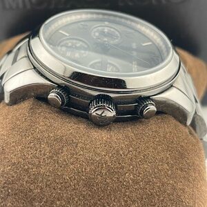 ✨ Michael Kors MK-5170 stainless steel watch with black dial and chronograph-style subdials + date window. 10 ATM water resistance (as marked on caseback). Includes original MK box, pillow, booklet, and extra links (see photos).