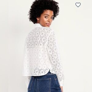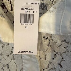 Old Navy Cropped Lace Button-Down Shirt, Size XL. New w/tags. Color: Calla Lily. Pit-to-Pit: 27.5". Length from shoulder to bottom hem: 23". spread collar