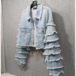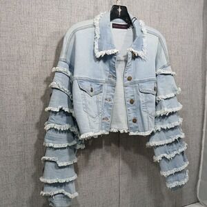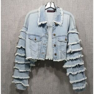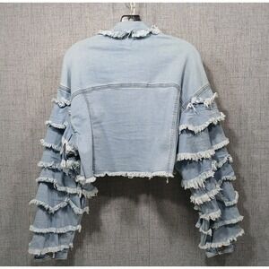 Tiered Ruffle Sleeve Cropped Denim Icy Blue Boho Jean Jacket Wms Large