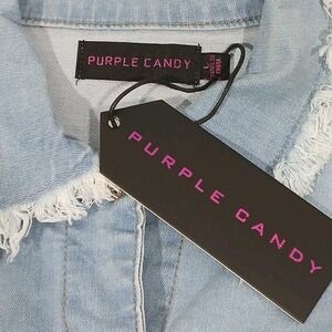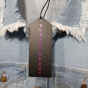 This Purple Candy Ruffle Sleeve Cropped Denim Jean Jacket in women's size Large is perfect for a western festival or a rocker girl look. With a solid blue color and denim fabric, the jacket features ruffle sleeves, frayed detailing, and a collared neckline. The cropped length and long sleeves add to the stylish and trendy appeal of this button-up jacket. Complete with a Western Cowgirl, Rocker Girl, or Bohemian Chic theme, this jacket is a must-have for those who want to make a statement with their outerwear.