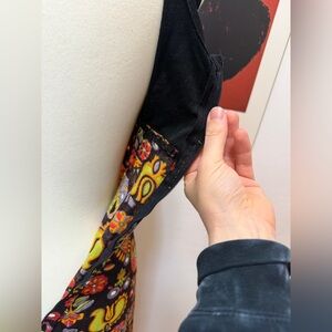 True vintage maxi dress with a striking folk/psychedelic novelty print featuring elephants and floral motifs. Classic late 60s–early 70s silhouette with a fitted, stretchy black poly knit bodice and a straight maxi skirt in a brushed, slightly fuzzy polyester fabric. Finished with a ruffled hem for subtle movement.