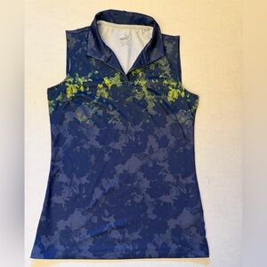 Puma Golf Stylish sleeveless tank with splash pattern. Navy base with lime accents. 92% poly & 8% elastane fabric with UPF 40 UV resistant finish dry cell.Perfect for casual wear. Pre owned in good condition.