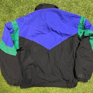 Vintage 90s Swingster colorblock windbreaker with green, blue, and black panels. Lightweight nylon shell with zip front and elastic cuffs. Made in the USA.