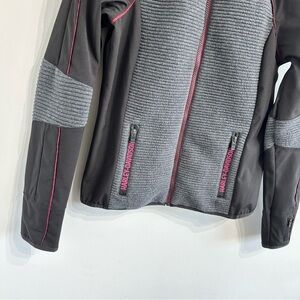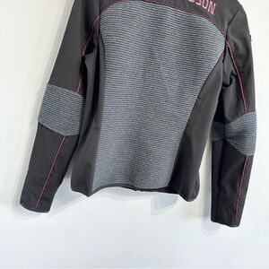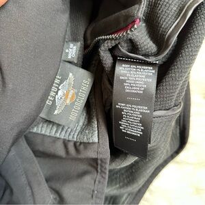 Black and gray jacket from Harley Davidson. Mixed media with ribbed knit and soft shell. Zip closure with high neck collar. Secure zip pockets. Stow-able hood. Great preowned condition.