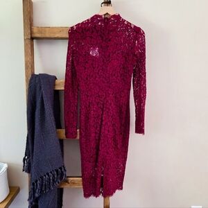 Elegant Bardot lace dress in a striking deep red. Features sheer floral lace overlay, high neckline, and long sleeves for a sophisticated, romantic look. Perfect for cocktail parties, weddings, or formal events.