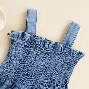 This smocked denim romper is beautifully designed with layered ruffles and comes with snaps at the bottom for quick and easy changing. A absolute must for this summer!