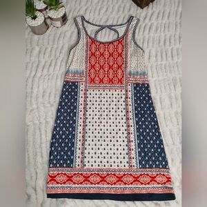 This vibrant sleeveless women's dress features a mix of red, blue, and white patterns. Perfect for any occasion, it offers comfort and style.