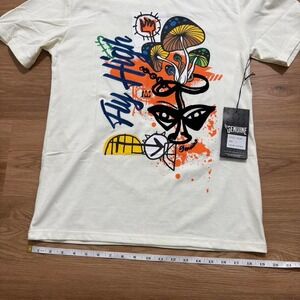 Eye-catching graphic tee featuring mushrooms, bold graffiti-style text "Fly High," and abstract art. Lightweight cotton with a natural off-white tone — perfect for layering or wearing solo.