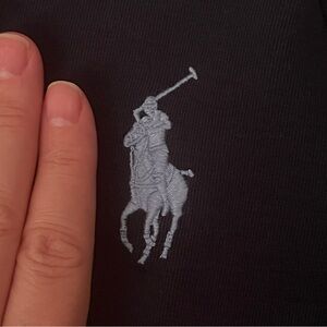 Stylish navy blue jacket featuring light blue and white accents. Iconic Polo Ralph Lauren big pony logo on the chest. Two slit pockets. Light/sweatshirt material. Can be worn as a jacket or a top. In pristine condition, pet-free, smoke-free home