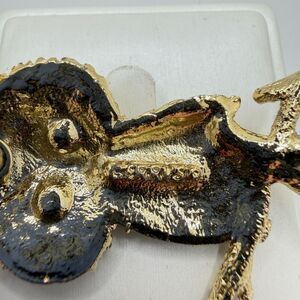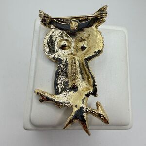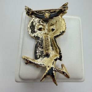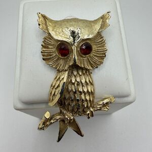 This is a signed Gerry's brooch/pin! It's a gold tone metal, and the owl eyes are a red cubic zirconia rhinestone.