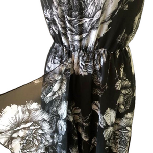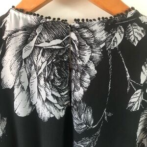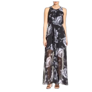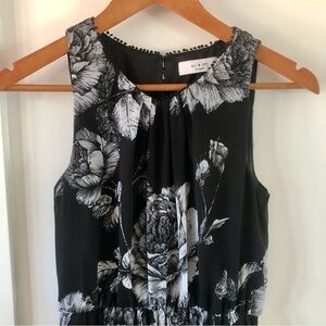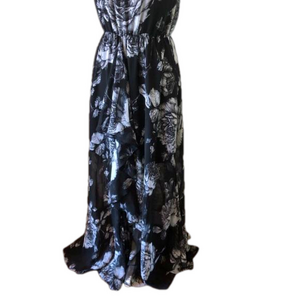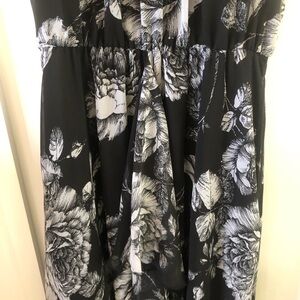 Floral sleeveless maxi dress by Ali and Jay, size small, black and white, in excellent pre-owned condition. Perfect for a wedding guest, bridal or baby shower, garden party, afternoon tea, date night, resort, special event. Elasticized waist, keyhole opening at back of neck, embellished detail at neckline, ruffle on front of skirt, lined on bodice and halfway down skirt. Flowy, feminine, lightweight.